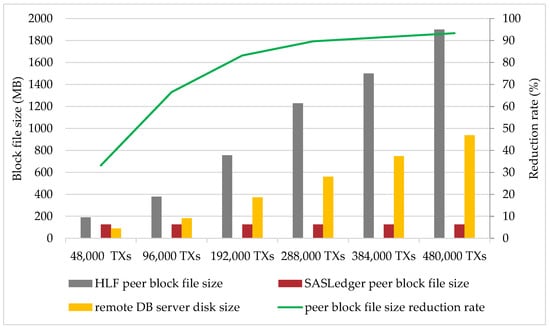 Our solution can be applied in blockchain systems constructed with HLF to enhance its storage scalability by simply replacing the vanilla HLF peers with the modified SASLedger peers and deploying the remote DB server. For conventional HLF blockchain systems, if the storage spaces of peers are insufficient, additional hard disks need to be installed to each peer; however, in a SASLedger blockchain system, new hard disks only need to be installed in the remote DB server, which reduces the budget.
