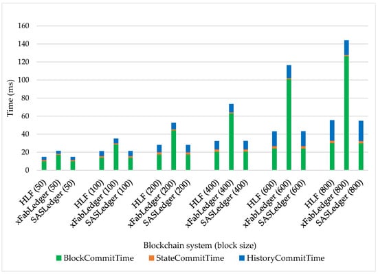 Figure 8 shows the block commitment latency comparison of HLF, xFabLedger, and SASLedger when the block size is changed. The block commitment latency is the time at which a block and its relevant information are recorded. It can be divided into three parts: