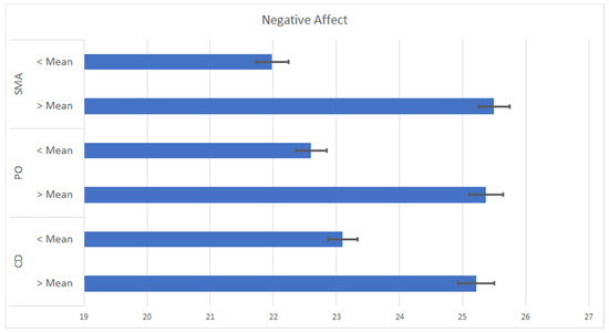 Figure 1. PANAS_NA (negative affect) means comparison between individuals with CD, PO, and SMA scores above or below the observed mean.