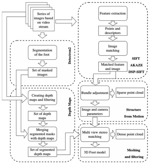 In this study, the approach of photogrammetry was defined as the main method for reconstruction. The application of modern algorithms of photogrammetry and computer vision makes it possible to obtain the qualitative reconstructed lower arch of the foot, which is necessary for individual orthopedic footwear manufacturing. The main feature of the methodology is the use of a series of images obtained from a smartphone at home. Figure 1 shows a schematic representation of the methodology, the interaction of algorithms, and the process of reconstructing 3D models.