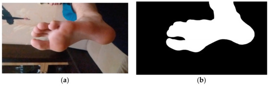 The author of [28] proposed the use of the following convolutional network architectures (CNN): ENet [29], LinkNet [30], MobileSeg [31], and FastLinkNet. The dataset for training was 111 images obtained by manual extraction of the foot contour, as well as the augmentation process, which was applied to the training sample. The following metrics were used to evaluate the results obtained: mean pixel accuracy, mean IoU, and mean dice. The best segmentation accuracy on the validation dataset was achieved using MobileSeg architecture. The scores for each of the proposed metrics were 97.78%, 95.52%, and 97.64%, respectively.