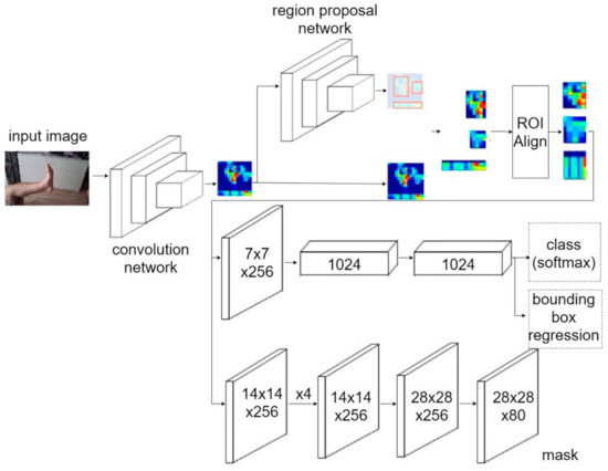 Detectron2 includes a set of detection models: Faster R-CNN [40], DensePose [41], Cascade R-CNN [42], and Mask R-CNN [43]. It was decided that Mask R-CNN would be used since it is used to segment objects in an image. Figure 4 shows the architecture of the Mask R-CNN.