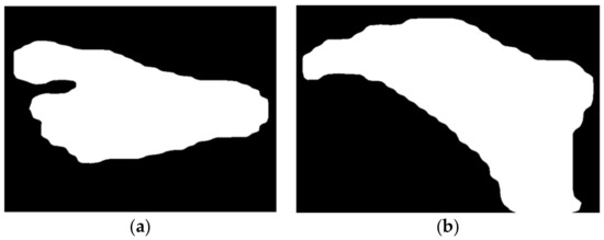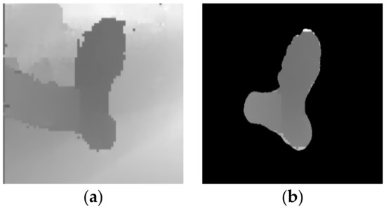 Segmentation of the shape of the human foot in the image is necessary to further clean the depth map data from objects that were in the background of the images. The concept of depth map segmentation consists of two objects: a black-and-white mask of a segmented foot and a depth map. These objects are converted into matrices of the same dimensionality. Then, each element in the depth map receives a value of “−1” if the element in the mask with the same indices has a value of “0”. The value “−1” in the depth map means that this element will not be used in future reconstruction.