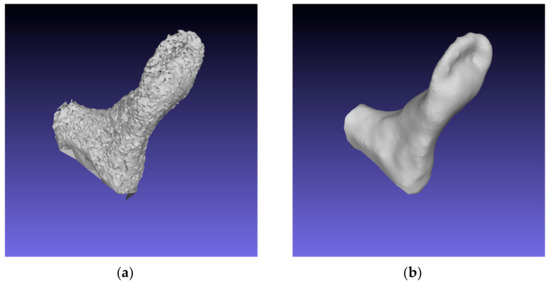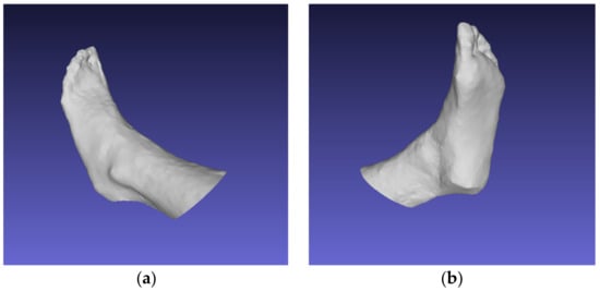 Demonstration of reconstructed 3D model #1 of the foot based on a series of images with resolution of 480 × 270 (pixels). (a) Left side of the foot; (b) Right side of the foot.