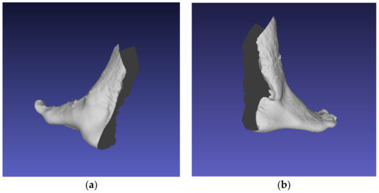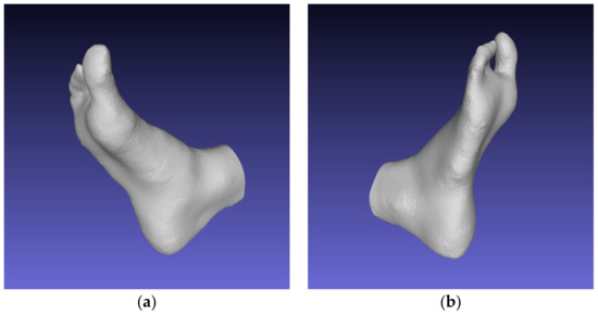 Demonstration of a reconstructed 3D model of the foot based on a series of images with resolution of 1920 × 1080 (pixels). (a) Left side of the foot; (b) Right side of the foot.