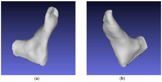 Demonstration of reconstructed 3D model #2 of the foot based on a series of images with resolution of 480 × 270 (pixels). (a) Left side of the foot; (b) Right side of the foot.