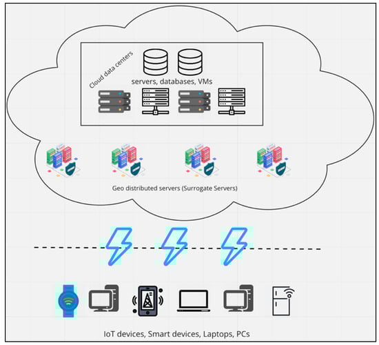 Content delivery networks (CDNs) are defined by the Internet and Engineering Task Force (IETF) RFC 3466 [9] as a type of network in which servers and contents are arranged in an effective manner with respect to clients. In CDNs, cache servers, also called surrogate servers, which have a copy of the main service contents, are geographically distributed around the world. This enables cloud providers to fulfill end user requests in a faster manner by relying on the nearest cache server. Figure 1 represents an abstract architecture of CDNs where cloud data centers have their own server instances in other geographic locations. The consumer represented as IoT device, PC, or laptop gets their request satisfied from the nearest servers.