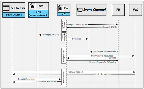 We present the proposed framework workflow with the Fog Worker (FW) as the first component. The FW has four main functions: self-registration to the FR, joining the local network nodes, pulling the resources, and serving the offloaded resources. The FW is software installed on fog nodes. Here, fog nodes are referred to as hosts. Once the FW is turned on, it sends a registration request to the FR. The registration request contains the following data about the fog node: node key, memory size, host operating system, longitude, and latitude. The self-registration function starts with a registration request sent by a post request following the Restful API standards made available by the FR. The FR then responds back with the registration details and with a universal unique identifier (UUID). The UUID can then be used by the FW to update any host information afterwards. If the FN is already registered, the FR will detect this via the node key and return the previously registered information. After a successful registration, the FN announces its availability in the network for other nodes and edge devices. This is done by a broadcast message in the same local network. After this step, edge devices, more specifically the Fog Browser, know that there is a fog node available in the same network. The FW then subscribes to the event channels. When any new web service is deployed in the cloud servers with fog-CDN enabled, it is published in the event channels and the FW starts pulling all the resources in parallel. If the FW successfully pulls all the available resources, it stores them locally and makes them accessible to the local network via the same cloud URL prefixed with the fog node host IP. For example, if a resource URL such as https://example-service.com/images/fog.png (14 December 2021) is used, it will be made accessible in the local network via http://192.168.1.6/example-service.com/images/fog.png (14 December 2021). Furthermore, the FW reports to the FR that it can serve these resources. Accessing the resources from a local network in this manner provides direct quick access to the resource for all the other devices in the same network. The FW has a microservice running in the background to provide these resources in HTTP. Providing the resources via HTTP, the same protocol they get requested from the cloud, makes the Fog Browser implementation much simpler, as it would only prefix the requested resource with the FN IP. Figure 5 explains all the FW functions in a sequence diagram and the communications with other framework components. The FW and the Fog Browser are both software installed on the fog nodes and edge devices, respectively. This why the host device is outlined by a blue rectangle.