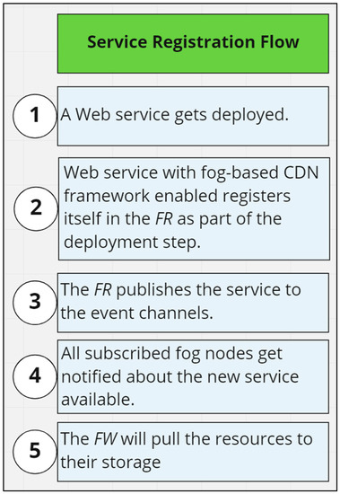 As shown in the abstract architecture of the proposed framework in Figure 4, the FR is the knowledge base of the proposed framework. The FR stores the fog nodes connected to the cloud providers and the services deployed in the cloud provider’s servers. Each fog node in the outer layer of the network spectrum registers itself to the FR by the FW operating on them. Web service engineers who want to utilize the fog architecture to provide better resource availability need to register their service in the FR with each service deployment. This can easily be part of the web service Continuous Delivery (CI/CD) pipelines. During the deployment stage, the web service (WS) registers itself to the FR. The WS registration requires the following data: service name, resources endpoint, HTTP method, and response schema. Service name is a unique identifier for the service, and it should be unique for all the services hosted by the same cloud provider. The domain name is the preferred choice. The resources endpoint is the URL used by the FW to list all the available resources for this service. This URL should be accessed by the FW using the same HTTP method stored in the FR. The resource listing format by this endpoint can vary from one service to another; therefore, the input schema is provided as an optional field. When it is not provided, the FW will assume the listing to be a JSON list of URLs. Upon the successful registration of a service, the FR publishes information regarding the new service to event channels. After that, all subscribed Fog Workers start the offloading process. The web service registration steps are shown in Figure 6. The FR is unaware of a fog node being active or not. It simply acts as a knowledge base that maps the fog nodes with the offloaded services. The Fog Browser is the component responsible for detecting whether a fog node is active or not.