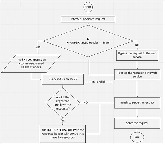 The Fog Browser enables edge devices to utilize the proposed framework and communicate with nearby fog nodes (FNs). It has three main roles: discovering the nearby fog nodes, normal browsing, and retrieving the resources from the nearby fog nodes. First, the Fog Browser sends a broadcast message in the network asking if there are any available fog nodes reachable in the local network. If the FW is operating with any fog node nearby, it will respond back with the UUID they received during the FR registration. To keep the Fog Browser updated, it keeps listening for any new fog node that may join the network. The Fog Browser keeps updating the list of UUIDs of the nearby fog nodes. In any browsing request, the Fog Browser adds two headers to the request: X-FOG-ENABLED and X-FOG-NODES. The fog-enabled header will have a Boolean value that indicates whether the browser has any nearby fog nodes registered or not. If true, the fog nodes header will have a comma separated list of UUIDs of the fog nodes. The Fog Service Locator (FSL) is a layer between web servers and web services. When a request is received with a fog-enabled header set to true, the FSL queries the FR asynchronously with the received UUIDs and service name. After the request gets processed, it adds a response header X-FOG-NODES-QUERY with UUIDs that have the service resources offloaded. The FSL acts as a proxy in case the fog-based CDN headers do not exist or the fog-enabled header is set to false. Figure 7 shows a flowchart of the FSL processes. After that, the Fog Browser receives the response, and, based on the fog node query header, it pulls the requests from the nearby fog nodes. The fog node might get turned off while the request is processing. Here, the Fog Browser uses the original resources as a fallback.
