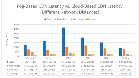 Fog-based CDN latency (different network distances) vs. cloud-based CDN latency.