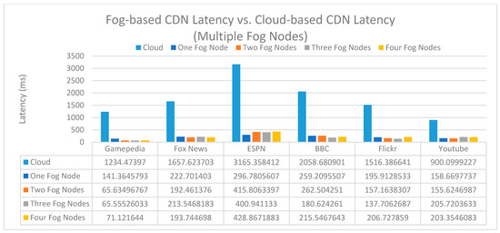 Fog-based CDN latency (multiple fog nodes) vs. cloud-based CDN latency.