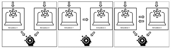 Simulations orchestrations (independent (left), sequential (middle), and parallel (right)).