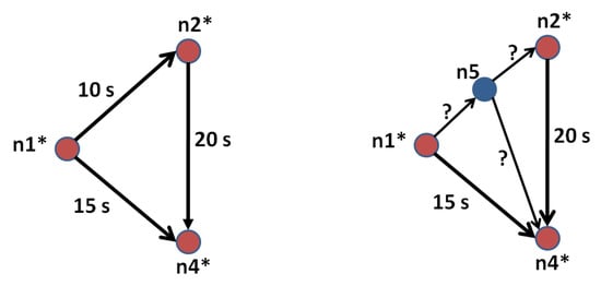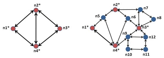 Not all simulations represent the transportation network () in the same way. The level of detail is not the same in a simulation of a few roads and in a simulation of an entire region. In some simulations where the represented area is wide, the transportation network is usually simplified. Some arcs of the network can be aggregated together or even deleted to optimize computation times, as explained in [37]. Figure 2 is an example of two representations of the same transportation network where the red nodes are present in both networks while the blue nodes are only found in the detailed representation.
