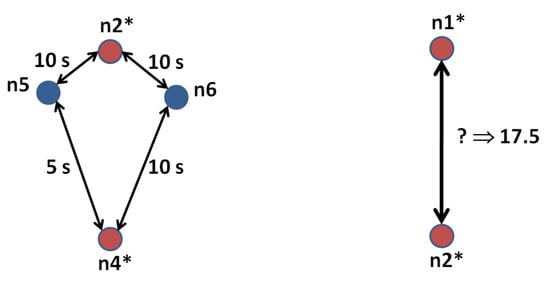 Figure 3 shows the transition from the detailed network to the aggregated network. We compute the travel time of the aggregated link, as the average of the travel times of its corresponding paths. In the example of Figure 3, we obtain Equations (7) and (8):