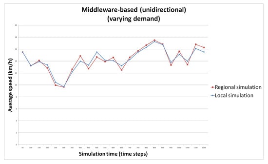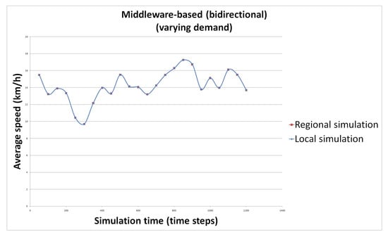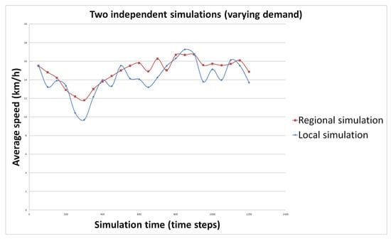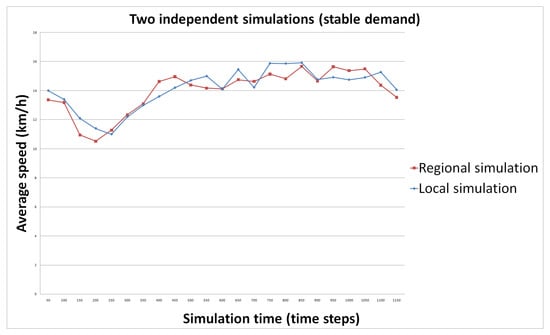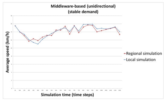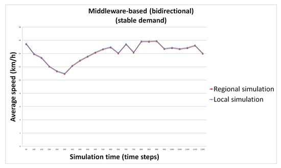 To verify this hypothesis (the use of the middleware allows for the behavioral convergence of two mobility simulations), we compare the scenario 1 (Figure 7) on the one side (average speeds for individual simulations) and scenarios 3 and 5 (average speeds for composed simulations) on the other side (Figure 9 and Figure 11). We note that the middleware succeeds in limiting (S3) and even eliminating (S5) the incoherence between the two simulations. The standard deviation of average speeds between the regional simulation and the local simulation is of 0.63 km/h in S1, 0.46 km/h in S3, and 0 km/h in S5. The difference may look small, but recall that the origin–destinations of the two simulations are quite similar (). Hypothesis 1 is then valid.