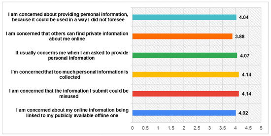 Compatibly with their responses for privacy concerns, participants declare to be a lot of bothered, when they provide personal information to many social networks (M = 4.32), while they also rate highly enough their doubts to provide them, when they are asked by the networks (M = 4.13). Ref. [57] support that the unwanted access to personal information or the over-collection of personal information constitute important faces of the online privacy issues that should be addressed in a more user-centric way.