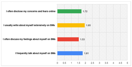 Previous research indicates a privacy paradox behaviour of users when utilizing SNs, since besides their concerns, they tend to disclosure personal information on their own [58], while it supports that much more attention should be paid towards the privacy risks they undertake their own due to this sharing information [59]. On the contrast, our findings show that participants’ self-disclosure behaviors are consistent with their privacy concerns and their perceptions for information collection within SNs, declaring that they disclose information in a low level, with reference to their concerns and fears (M = 1.72), writing about themselves (1.95) and talking about themselves (M = 1.81), as well as their feelings (M = 1.53). These are illustrated in the following Figure 3.