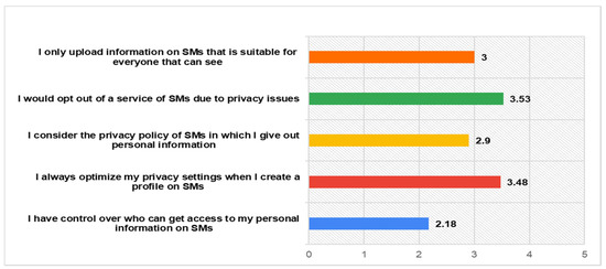 - Privacy Control: (a) I have control over who can get access to my personal information online, (b) I always optimize my privacy settings when I create an online profile, (c) I consider the privacy policy of SMs where I give out personal information, (d) I would opt out of a service due to privacy issues, and (e) I only upload information online that is suitable for everyone that can see [27,28,39,42].