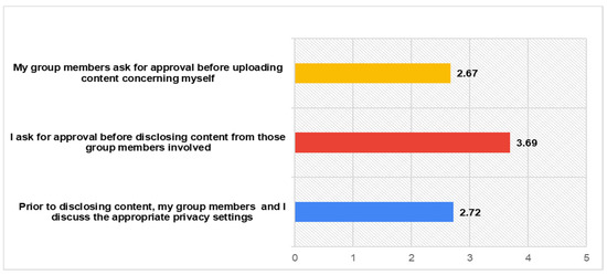 This information sharing among users can be a cause of potential risks for each one separately. Personal information disclosures of a user for other users, regardless other users’ approval, are common practices within SNS [62]. Findings support this previous knowledge, since participants rate highly enough (M = 3.69) only their own behaviour of asking approval, before disclosing information of their group members. As far as their group members concern, the rating is much lower. The participants’ responses regarding the collaborative privacy management within SNs are presented in detail as follows in Figure 5.