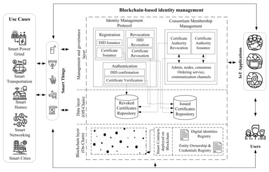 The Internet of Things is changing the era of digital identity drastically from user-centric to entity-centric [18,19], where identity management should focus on all entities participating in the IoT network. As all entities in the IoT have the same interaction ecosystem, the IoT identity management must be able to manage human-to-device, device-to-device, and device-to-application interactions and data exchange while taking into consideration the relationships between the different IoT entities, as shown in the Figure 1. All of the communication endpoints in the IoT ecosystem, such as users, smart things, and applications, should register and authenticate to the blockchain-based IDM. The blockchain-based IDM network is the backbone for the IoT system that formed by a defined consortium sharing the same industrial needs or business interests that are responsible for building and defining the network policies and governing the shared ecosystem. The blockchain-based IDM solution includes a consortium membership service and identity management protocol. The membership service is responsible for issuing and revoking authority certificates for the network components, such as BC admins, nodes, consensus ordering, and communication channels. Unlike the other works, our design aims to split the identity protocol into three phases identity registration, identity verification, and identity revocation, and each phase is taking place by issuing, resolving, or revoking unique identifiers as well as certificates to each entity. The identity protocol employs smart contracts to interact with the blockchain network. On the blockchain ledger, each block contains a set of identity transactions that are issued by the identity protocol. In addition to the decentralization, privacy, and security offered by DLT, our design goals include simplicity to provide an efficient protocol to meet the needs of all IoT organizations. Interoperability, to permit sharing sensors within and across organizations by following the decentralization standards. Extensibility, by employing only the main phases of an identity system on the top of the DLT structure, which can be tailored by all identity management of things models .