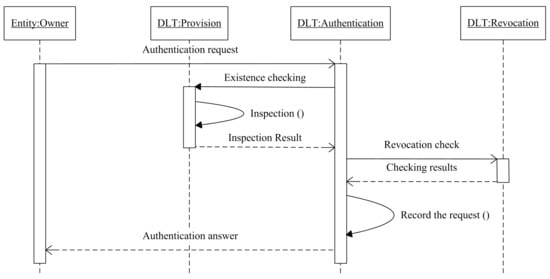 Identity verification or authentication is an essential feature in all identity systems, as it enables organizations to keep their networks secure by only permitting the authenticated entities to access the resources. As long as the entities registered to the network, authentication is the next step, where an entity is inspected by checking its credentials if matches in the distributed ledger. An entity sends an authentication request, and the platform checks the existence of the entity in the first place, then, if the entity exists in the ledger, the platform will record the request and send the authentication answer to the requester, as shown in Figure 4.