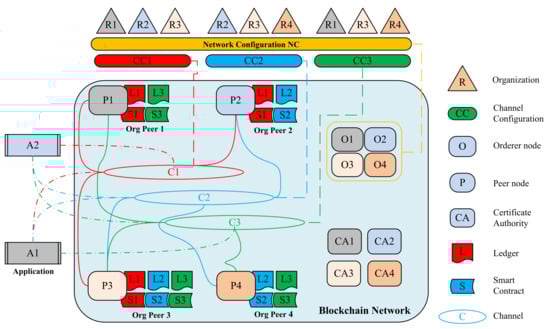 The permissioned blockchain solutions maintain an access control layer in order to allow only identifiable participants or organizations to perform actions in the network. An organization itself manages a group of members and participants (nodes) in the network with the help of the membership service provider (MSP). Each organization has an MSP connected to the certificate authority (CA1, CA2, CA3, and CA4) responsible for issuing nodes credential and maintaining all of the participating nodes in the system, authenticating all of the interactions occurring in the network, and verifying the integrity of transactions typically by digital signatures. After recognizing the participating organization, a network initiator or a network configuration (NC) that formed by the organizations to define and control the network nodes, channels, and interactions.