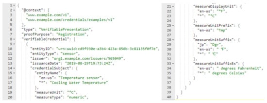 All of the sensors and services in the smart home have to register to the distributed identity network once and authenticate each time they react with another object. We attached the payload of sensor registration as shown in Figure 6, which is a JSON document that contains the essential information regarding the organization issued the document, owner, and associated sensor information. Another critical point is that only admins that are approved by the consortium can perform the registration procedure and the membership service provider (MSP) system in Hyperledger Fabric is responsible for creating users and administrators of the network.