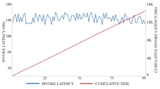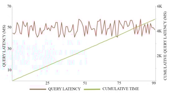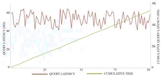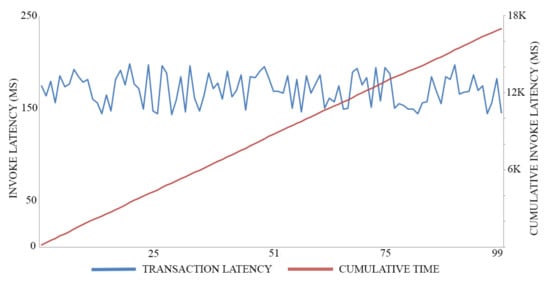 In this experiment, we adopt 0.5 MB as a block size for maximizing the throughput of both registration transactions and authentication transactions, executing 100 trials for each action. The average time of registration invocation transactions is 170 (Ms), with a throughput of six transactions per second, as shown in Figure 7. Meanwhile, the average time of query transactions is 52.5 (Ms) with a throughput of 19 transactions per second, as shown in Figure 8. The average time of authentication invocation transactions is 145 (Ms), with a throughput of seven transactions per second, as shown in Figure 9. Meanwhile, the average time of query transactions is 49.5 (Ms) with a throughput of 20 transactions per second, as shown in Figure 10.
