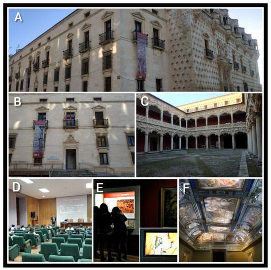 Museum of Guadalajara. (A) Facade of the Infantado Palace. (B) Access door. (C) Courtyard of the Lions. (D) Talk about museography. (E) “Transits” room (lower right frame: Video, in another room, on the cave paintings). (F) Room of “El Palacio del Infantado: Mendoza and power in Castilla”.