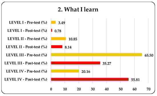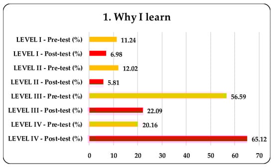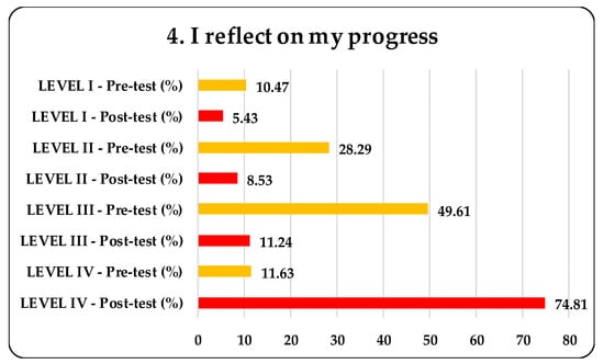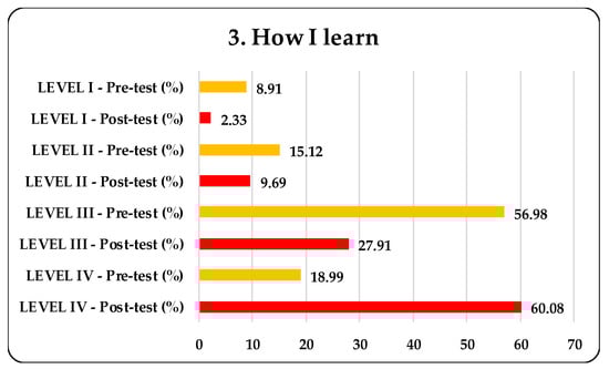 In this experience, the system of categories by level of progression on the competence learning to learn showed visible differences between the pre-test phase and the post-test phase for the four dimensions [] (p. 15), as can be seen in Figure 6, Figure 7, Figure 8 and Figure 9: “1. Why I learn (attitude towards learning and willingness to learn); 2. What I learn (setting objectives and planning activities); 3. How I learn (organized and targeted learning activities); and 4. I reflect on my progress (reflection on learning activities and outcomes and self-assessment)”.
