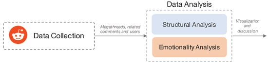 The pipeline consists of two core modules, namely (i) data collection and (ii) data analysis. The former includes the process devoted to collect the data from Reddit. Starting from a list of subreddits S and a time span T, the data collection module retrieves the megathreads posted within the time range T in each subreddit , along with their related comments and users. The module is detailed further in Section 4. The collected data are then used as output for the data analysis module. It consists of two components representing the main analyses of our proposed study, which are structural analysis and emotionality analysis, and are discussed in detail in Section 5.1 and Section 5.2, respectively. The output of the data analysis module can be then used in several contexts. In our study, we visualized the results by making use of several charts and discuss them. Nevertheless, the pipeline is flexible enough to accommodate further captivating features. As an example, one could use the output of the data analysis module to create a dashboard where the interested user can analyze the data in real time.