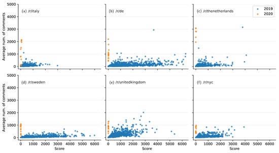 Distribution of the average number of comments per subreddit against the scores of the submissions to which they refer: (a) /r/italy, (b) /r/de, (c) /r/thenetherlands, (d) /r/sweden, (e) /r/unitedkingdom and (f) /r/nyc subreddit.