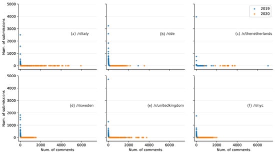 Another interesting aspect to investigate is the distribution of submissions against comments. Although the submissions related to 2020 consist only on the megathreads, the number of comments may vary. In this case, it is useful to understand if this variation is similar or different between 2019 and 2020. Figure 4 illustrates this variation. In this figure, both axis were limited in order to maintain a common range for a better visualization, while preserving the precision and the completeness of the data. The analysis of this figure allows us to better understand the distribution of submissions against comments.
