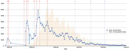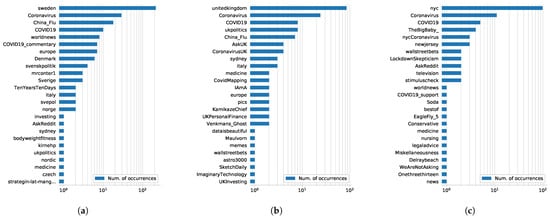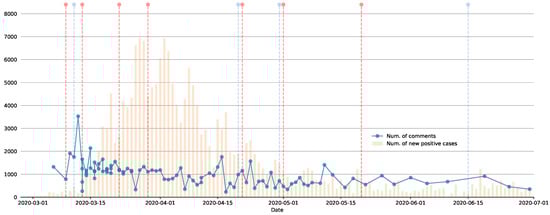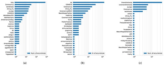 Studying users’ reactions to specific events is a particularly relevant task in order to understand latent feelings and, consequently, help governments and managers in adopting the best policies in order to address people satisfaction and safety. However, identifying topics from extensive text repositories, or at least identifying resources related to a specific topic, is still recognized as a difficult research task [,]; consequently, any analysis of user reactions to specific topics at large scale may be flawed by dirty or missing data. The recent pandemic spread of COVID-19 disease [] impacted millions of people all around the world. At the time of writing this manuscript, almost 19 million confirmed cases have been registered worldwide, with 208 countries, areas or territories showing cases. Governments around the globe have been forced, in one way or another, to implement protective measures such as lockdowns, social distancing and travel bans to contain the spread of the disease. This resulted in more and more people increasing their online experiences of accessing information and sharing feelings. Among others, the social platform Reddit (https://www.reddit.com/) experienced a tremendous increase in new users and posts (https://www.redditinc.com/), attracting the interest of the academic community [,,]. Reddit is a heterogeneous crowdsourced news aggregator and social platform, and at the time of writing, it is ranked 18th in the Alexa’s top 500 global websites. Reddit comprises subreddits, a set of interest-based communities where users can submit content and comments. Currently, there are more than 2.2 M subreddits.