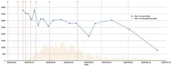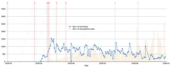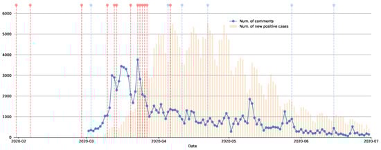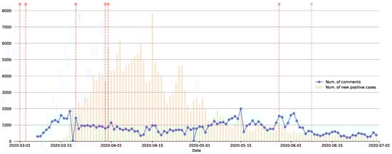 In summary, understanding how social users react to dramatic events, like the COVID-19 pandemic, and the corresponding real-life events is already a research topic of interest per se; however, the outcomes of the present study may guide data managers and software developers to better cope with people interests and satisfaction even when they face extreme and non-standard real-life situations []. Moreover, the analyses conducted in the present paper can be well supported by automated tools; these can be put side by side with standard, but more invasive, mechanisms like questionnaires in order to help governors in monitoring a person’s stance about a specific topic. In particular, automated dashboards from an emotionality analysis on social networks may overcome the intrinsic latency of questionnaires, providing timely information as soon as new data (comments) are produced.
