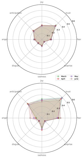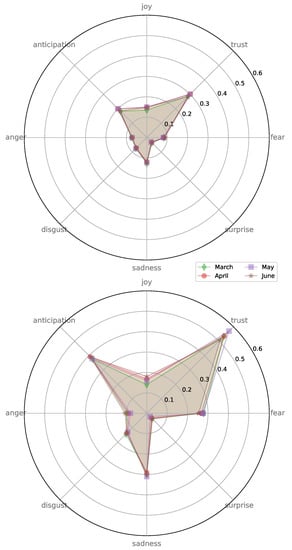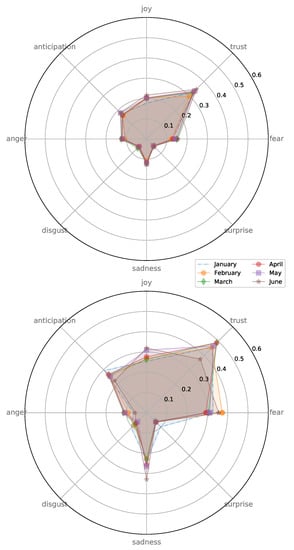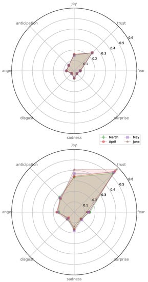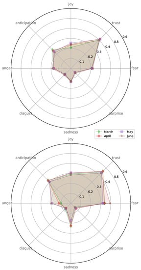 The Netherlands approached the COVID-19 pandemic in a slightly softer way than Germany and Italy, showing lower numbers of daily infections with respect to these countries (see Figure 5, Figure 6 and Figure 7). This motivates the values of fear which were intermediate between Germany and Italy and constantly decreased through the considered months. Emotions were mostly centered on trust, joy and anticipation. Expression of sadness was quite constant and low, as well as trust which was quite constant and high.