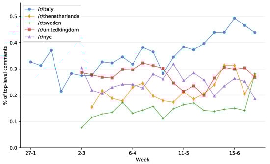 Since skepticism is not one of the basic emotions, in this analysis we did not concentrate on the top expressed emotions, like in the previous sections, but we measured the percentage of comments expressing skepticism in one way or another. However, we continued to concentrate on the top comments since they specifically expressed the stance about COVID-19 of the user posting it. Finally, we conducted this analysis on a weekly basis, in order to evaluate the corresponding trend more precisely. Obtained results are depicted in Figure 21.