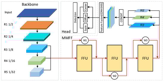 The overall architecture of the proposed AFFDet is shown in Figure 1, which consists of three parts: Backbone, MFFM, and Detection Head. The backbone outputs the feature maps of , and . MFFM fuse the multi-scale feature maps through these feature maps and output a final feature map after weighted multi-level feature fusion. The detection head module consists of three branches, which are the branch of center point prediction, the branch of the offset prediction, and the branch of the scale prediction on the final feature map.