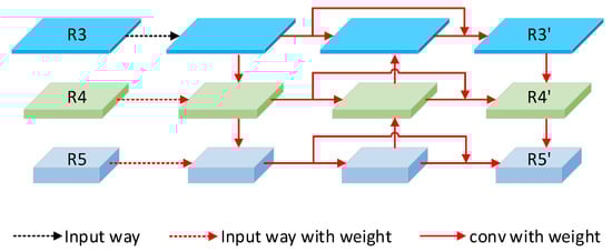 The internal structure of MFFU is shown in Figure 2. First of all, we use step-by-step upsampling and fusion, and also step-by-step downsampling and fusion, but we only do it in , , and . Specifically, firstly, , , and are convoluted by 3 × 3 kernels. Then the convoluted , , and are bottom-up and top-down, respectively, and then connected horizontally. To solve the problem of original information loss after an MFFU, we add a shortcut structure. At the same time, for each process of feature fusion in the MFFU and the shortcut, how they achieves the best effect of feature fusion, we add the weight parameters that can be learned to every branch, which is denoted as in Figure 2, so that we can get the best fusion weights through training. In this way, more advantageous information can be contained in both the lower-level feature maps and the higher-level feature maps, and the feature map of each scale has a more consistent degree of feature fusion.