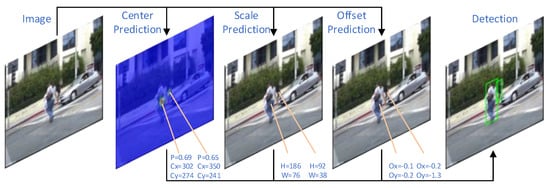 The output of the MFFM is the input of the detection head, and the multi-scale features in MFFM have been fully fused for detection. And then three prediction branches are used to predict on the final feature map . Specifically, the first branch uses a 1 × 1 convolution layer to process to generate the center heatmap. The second branch performs a 1 × 1 convolution layer to obtain the offset of the center point. The location and score of the center point of the object can be obtained through the center heatmap. However, because the scale of is down-sampled compared with the original image scale, the predicted location directly using the center heatmap will have deviation, which will result in inaccurate positioning. Thus, the offset branch is just to learn this deviation to offset it. In the third branch, a 1 × 1 convolution layer is performed to generate the scale map, and the length and width of scale values of each object corresponding to each center are obtained.