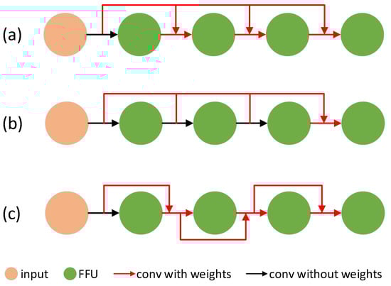 In terms of the connection modes of MFFUs in MFFM, we have tried many different structures. Their structures are shown in Figure 5, and their experimental results are shown in Table 2. For (a) structure in Figure 5, the feature maps output from the previous MFFUs and the original feature map output from the backbone are added with weights and then input to the current MFFU. In this way, the deep structure can retain some original and lower-level features, but its experimental performance is not good, and its is 4.12% when level = 3. For (b) structure in Figure 5, the output of all MFFUs before the last MFFU and the original feature map output by backbone are added in the form of weights and then output to the last MFFU for processing, but it may be that the last MFFU cannot process and fuse so much information well. This method is not effective, and its is 4.35% when level = 3. For (c) structure in Figure 5, starting from the original feature map output by backbone, the weighted addition of the output of the current MFFU and the shortcut of the input of the current MFFU has the best effect, and its MR is 3.65% at level = 3, far better than that of (a) and (b). Among the three structures, (a) is the fastest and (c) is the slowest, but there is just slight difference in the overall speed. (a), (b) and (c) are 35.9, 35.1 and 32.3 respectively when level = 3. Experiments show that (c) structure of our MFFM has the best comprehensive performance and speed, and has great advantages.