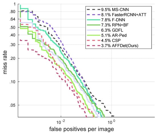We use Caltech as a benchmark. Figure 6 shows the comparisons with other methods under the setting, Figure 7 shows the comparisons with other methods under setting, and more methods are compared in Table 3. AFFDet, our proposed method, achieves 3.7% under the setting, which is 0.8% better than the closest CSP’s 4.5%. Compared with the stricter setting, we are even more ahead, and have achieved 21.0% , which is 4.8% better than the closest CSP’s 25.8%. And in terms of speed, our AFFDet achieved 32.3, which is faster than the officially implemented CSP’s 23.6. For the case of heavy occlusion, we also achieved 43.2%, which has a better effect of more than 4% compared with 47.9% of RepLoss detector specially designed for occlusion problem. This shows that our adaptive multi-level and multi-scale feature fusion method is very effective in pedestrian detection, and our performance is ahead of other methods.