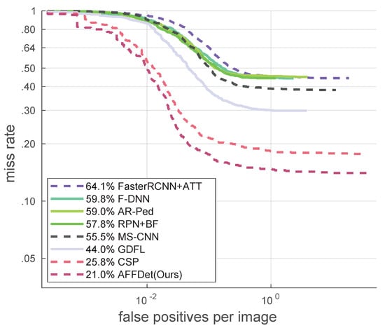 The evaluation standard used by Caltech is log-average Miss Rate over False Positive Per Image (FPPI) ranging in , which is denoted as , and the lower curves or the smaller numbers indicate the better performance. In this paper, the default refers to the Reasonable setting which is the general setting with , and it will be specifically indicated if it is IoU = 0.75 setting.