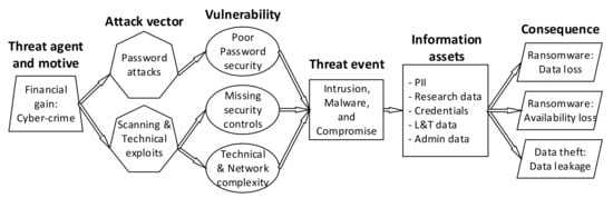 Beaudin [21,22] discusses the legal implications of data breach in HE when storing student data and cybersecurity regulation under state and federal law. Hussain et al. [23] specifically considers the risks among online social networking in HE in Malaysia, focusing on cybersecurity risk towards lecturers. A similar study focuses on cybersecurity risks facing academic libraries [24].
