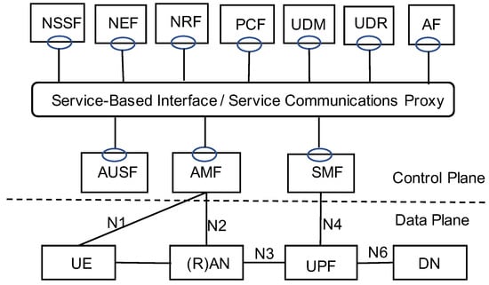 As depicted in Figure 1, the 5G SBA decouples the data plane and the control plane. The data plane comprises User Equipment (UE), the Radio Access Network (RAN), the User Plane Function (UPF), and the Data Network (DN). The interfaces between the data plane functions currently are still defined as reference points (N1–N6 in Figure 1). The 5G control plane comprises a set of NFs including the Access and Mobility Management Function (AMF), the Authentication Server Function (AUSF), the Session Management Function (SMF), the Policy Control Function (PCF), the Network Slice Selection Function (NSSF), Unified Data Management (UDM), the Unified Data Repository (UDR), the Network Repository Function (NRF), the Network Exposure Function (NEF), and the Application Function (AF) [22].