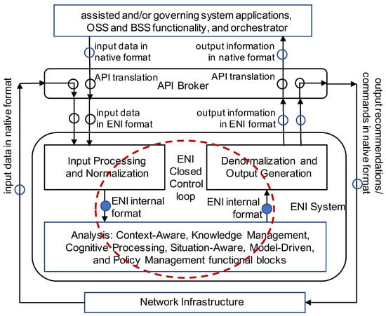 As shown in Figure 3, the ENI architecture comprises three main modules—the input processing module, the analysis module, and the output generation module. The input processing module contains the data ingestion function and the normalization function. The analysis module consists of functions for knowledge management, context-awareness, cognition management, situation-awareness, model-driven engineering, and policy management. The output generation module comprises the denormalization function and the output generation functions [34].