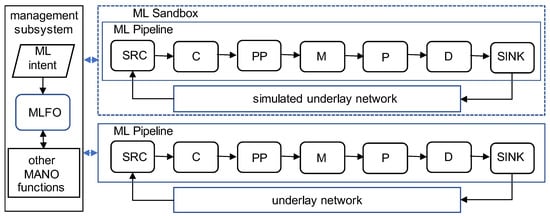 The high-level structure of the ITU-T architecture for integrating ML in future networks is depicted in Figure 4. This architecture comprises three subsystems—the ML pipeline subsystem, the management subsystem, and the ML sandbox subsystem [38].