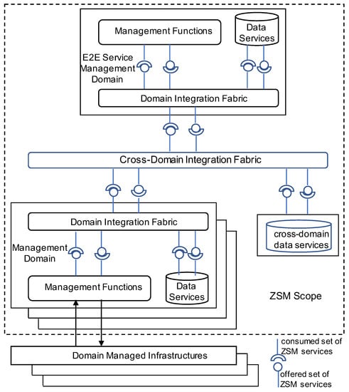 As a service-based inter-domain management framework, the ZSM architecture must provide a flexible platform for supporting communications and interoperation of the management functions with respect to the offered and consumed management services, not only within each MD, but also across different MDs. The integration fabric is the mechanism defined in the ZSM architecture for achieving this objective. The integration fabric provides functions for supporting registration/deregistration, discovery, selection, and invocation of management services and providing both synchronous and asynchronous communications among management services. The ZSM integration fabric comprises two levels—a domain integration fabric in each individual MD (including the E2EMD) and a cross-domain integration fabric for supporting service orchestration across different MDs.