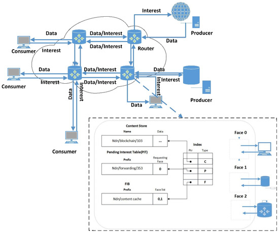 - Guo, J.; Wang, M.; Chen, B.; Yu, S.; Zhang, H.; Zhang, Y. Enabling blockchain applications over named data networking. In Proceedings of the ICC 2019—2019 IEEE International Conference on Communications (ICC), Shanghai, China, 20–24 May 2019; pp. 1–6. [Google Scholar] [CrossRef]